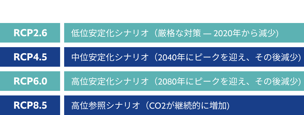 科学者は将来的影響に関するモデル分析を進めており、IPCC[気候変動に関する政府間パネル]が策定した四つの気候変動シナリオ[RCP(代表的濃度経路)シナリオ]に基づく予測を明らかにしている: